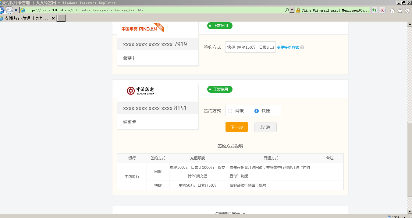 第一步 (App不支持操作)通過匯添富官網(wǎng)(www.778ck.com)網(wǎng)頁登錄現(xiàn)金寶賬戶,點(diǎn)擊“首頁”-“銀行卡管理”,點(diǎn)擊“變更簽約方式” ,選擇“快捷”模式