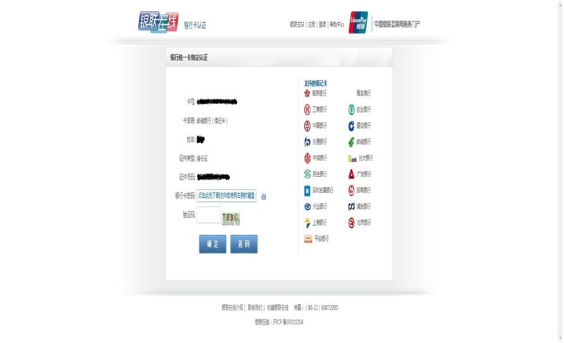 5.跳轉“銀行統一卡綁定認證”頁面,輸入銀行卡密碼和驗證碼,點擊“確定”
